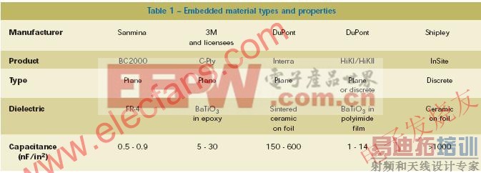 分立的嵌入式电容器的制作方法是通过在金属层(通常是在一块方形的蚀刻过的铜箔)上印制高介电常数的电容粘剂,经过高温硬化处理后,在上面印制或电镀另一金属层。此外还有一种新颖的做法——DuPont公司在铜箔上需要的位置,按照需要的尺寸印制电容材料并进行高温燃烧。然后将其层压并蚀刻掉多余的铜箔。由于该电介质的介电常数非常高(1000+),其电容可达到180nF/in2。Shipley公司的产品的介电常数则更高。这样的一些新材料及其特性见表1。不是所有的这些材料都能被商用,但其中的一些在将来会被应用。