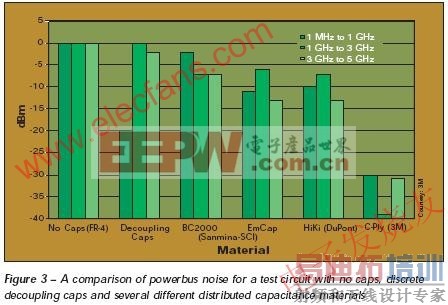 对一个测试电路分别在没有电容、分立的退耦电容和几种不同材料制成的分布式电容的情况下,对其电源总线噪声进行测试,其结果见图3。可以注意到,分立的电容在频率上升到5G时失去其作用,而嵌入式电容仍然起作用。