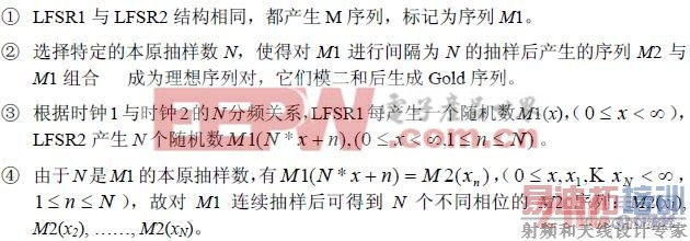 ⑤ 将这 N 个不同相位的M2 序列与M1 序列模二和,生成N 个不同的Gold 序列。 该方法需要选定两个可构成Gold 序列的理想M 序列对,之后将能够从一个M 序列抽 样出另一M 序列的本原抽样数N 预先计算出来。由于是预先计算,不需在硬件内实现, 不占用硬件资源。因此该方法占用的资源较少,同时结构化的设计也适合于用硬件描述语 言进行设计。