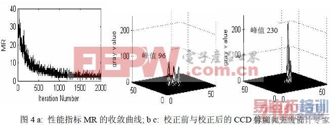 自适应光学系统实验方面,以均值半径作为本实验中SPGD 算法的性能指标[4],向极 小的方向进行梯度搜索,性能指标的收敛曲线如图4(a)所示。在迭代1000 次后,曲线就已 接近极小值。图4(b)和7(c)是进行校正前后,CCD 相机中获取的远场光斑的光强分布图。 校正前的峰值为96,校正后的峰值为230,校正后的远场光斑接近艾里斑,结果说明使用 SPGD 算法对静态的波前畸变达到了良好的效果,同时也验证了本方法所产生的伪随机序 列能够在实际的SPGD 控制算法中正常工作。