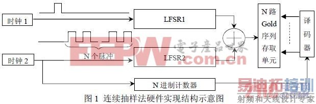 图中所示结构包括两个时钟,两个相同的线性反馈移位寄存器,N 进制计数器,以及N 路伪随机序列的存取单元。两个时钟有特殊的关系,即时钟1 是时钟2 的N 分频。N 进 制计数器的输出作为N 路伪随机序列存取单元的存储地址。存取单元及地址译码器可视为 一个整体,在实现时使用深度为N,宽度为1bit 的双端口RAM 代替(一个端口存数据, 另一个端口取数据)。此外,图中的“+”表示模二和。结构中的N 值,为本原抽样数, 即使用N 对M 序列抽样后,可得到另一同周期的M 序列。