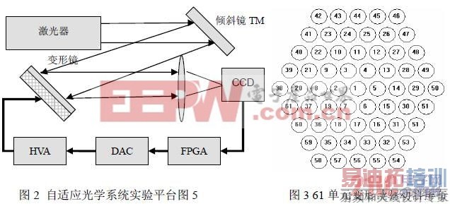 为验证上述伪随机序列生成方法的可行性,在FPGA 内对上述结构进行了硬件设计, 并搭建了基于SPGD 控制算法的自适应光学系统平台。自适应光学系统实验平台的结构如 下图3 所示,主要由激光器和扩束系统、倾斜镜TM、变形镜DM、CCD 相机、基于FPGA 的SPGD 算法控制处理器、数字到模拟转换器DAC 和高压放大器HVA 等组成。光源从激 光器发出后经TM 和DM 反射至CCD 相机,相机将图像数据传输给FPGA 板进行算法迭 代,再输出电压至数模转换,最后经高压放大后控制61 单元的变形镜DM(驱动器的排布 见图(3)和倾斜镜TM,完成闭环控制。