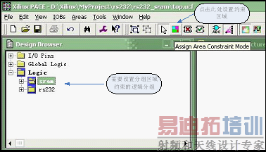 在“Processes for Source”中选择“Create Area Constraints”,启动设置分组区域约束工具PACE。分别选中sram和rs232,单击左上角的