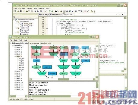本文使用CoDeveloper工具组作为C-HDL工具组用于该设计实例,而且只修改了软件Mandelbrot C程序以使其与C-HDL工具兼容。其中的改变包括:将软件项目分割成不同的进程(顺序执行的独立单元);函数接口转换(硬件到软件)到流;增加编译器指令来对产生的硬件进行优化。我们随后使用CoDeveloper工具组来创建Pcore协处理器,将该协处理器输入到Xilinx Platform Studio(XPS)。利用XPS,我们将PC连接到PowerPC APU控制器接口,并测试系统。