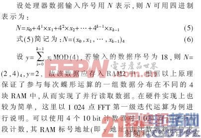 蝶形运算单元的设计是整个FFT/IFFT处理器设计的关键。完成蝶形运算的一次复数乘法包含4次实数乘法和2次实数加、减法,如果将乘数扩大1位,可将计算化简为3次实数乘和5次实数加/减法。为了提高处理速度,本设计采用四级流水线处理方式,有效地减小了关键路径时延。蝶形单元的数据从RAM输入及输出到RAM需要2个时钟周期,这里引入2级流水;对输入数据的实部和虚部分开并行计算,一次复数乘法只需3个乘法累加器即可完成,用4个加法器及4个减法器即可完成基4蝶形单元后续数据处理,再次引入二级流水。整个蝶形单元处理时间为4个周期,采用四级流水线结构后,以较小的资源代价有效提高了处理器的时钟频率。