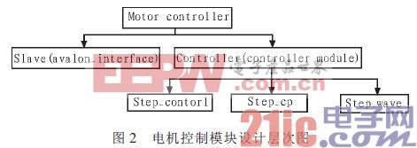 一般步进电机的控制器可以通过单片机来实现,本文电机控制模块是用verilog HDL语言实现、以IP模块的形式封装在SOPC Builder的IP模块库中,它是可以被NiosII系统直接调用的。图2为电机控制模块的设计层次图。