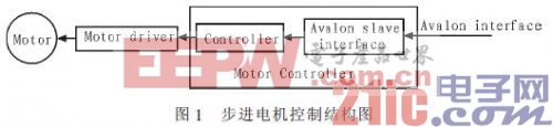 步进电机控制主要由电机控制器和电机驱动器两部分组成,如图1所示。其中,电机控制器用于控制产生脉冲,电机驱动器用于控制输出信号的功率放大。本文主要设计电机控制器。从图1可知,在电机控制器中含Avalon总线接口。在整个NiosII系统中电机控制器作为一个从设备使用。