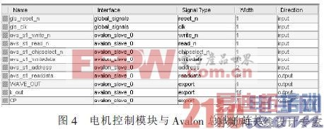 首先导入的HDL文件是用于描述模块的硬件逻辑功能。对于电机控制模块,导入的文件分别是motor.v、step_control.v、step_wav e.v和step_cp.V,其中motor.V是顶层文件,配置SOPC平台,如图4所示。