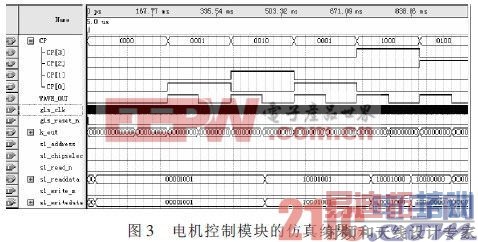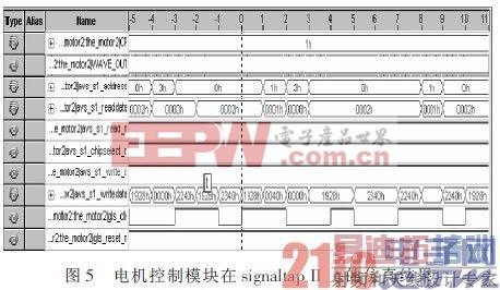 当通过SW开关设定不同的值时,相应控制电机的4路脉冲信号就可以通过led显示出来。同时,利用Quartus II中的signaltap II的对电机控制模块仿真如图5所示。仿真结果是与实际设计相符的。