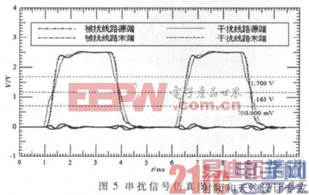 互感、互容使得相邻传输线间信号相互耦合从而形成串扰,传输线的间距是其中最关键的因素。本系统中大多数走线间距为15 mils,无需担心串扰问题,而BGA的扇出采用的是5 mils的间距, 并且存在许多长度在1 000 mils以上的平行线,串扰的仿真与降低串扰的影响成为设计过程中不可缺少的一个环节。采用SigXplorer对相邻BGA扇出微带线的模型进行了仿真,结果如图5所示。干扰源是125 MHz的时钟信号,被干扰线路为相距干扰线路5 mils的弱下拉平行微带线。可见在被扰线路的源端和末端产生了接近200 mV的串扰,属于电路正常工作可以接受的范围。