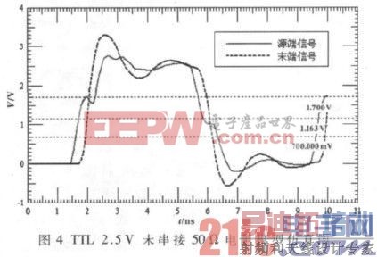 源端端接采取控制输出端的反射系数的方法。通过在源端串接一个电阻,使得串接电阻加上源端缓冲器的内阻接近传输线的特征阻抗。Cyclone IV系列产品均设计了OCT功能,可以选择使用片内串接电阻。使用SigXplorer软件首先提取PCB上AD9765数据线的传输线模型,然后与Altera提供的TTL 2.5 V串接50 赘电阻的IBIS模型进行125 MHz信号的反射仿真,仿真结果如图3所示。源端信号波形的幅度由于端接电阻的分压,在传输介质上的初始信号幅度降至满幅度信号的1/2,这1/2幅度的信号大约经过1 ns后到达末端。由于末端数字电路输入阻抗非常大,反射系数接近+1,从而得到1/2幅度的反射信号,与原1/2幅度信号叠加后在末端得到完整幅度的信号。反射信号再经过1 ns延迟后回到源端,被源端端接衰减,此类端接具有静态功率小等优点。
