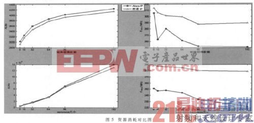 依据改进前后的IP核,使用Quartus9.1软件进行综合布局布线,映射到Stratix Ⅲ EP3SE110F780C2器件中,可获得相应的资源对比图如图5所示。由于采用的都是并行浮点乘加运算,所以在乘法器资源的消耗上不变;同时由于只是在存储器的存储方式上作出变动,所以二者的存储资源相等。从而只需要对图中显示的矩阵阶数、vectorsize大小进行比较即可,而浮点计算性能与最高时钟频率变化方向相同,所以只对ALM数量及最高时钟频率进行对比。
