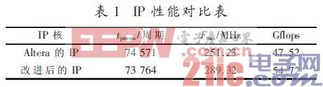 从表1中可以看出,改进后的IP核在处理时间上缩短了807个周期,同时在最高运行时钟上提升了15%,系统整体的持续性能增加了7.2 Gflops。
