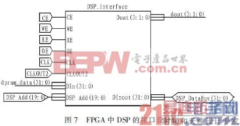 在完成对EMIF的DSP配置后,接下来就是实现EMIF接口的FPGA配置工作,保证FPGA中的数据正常的读入到DSP中。在FPGA中配置EMIF接口的连接图如图7所示。