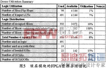 图5给出了顶层模块的FPGA资源占用情况,由图5可见,该系统的资源占用率非常少。