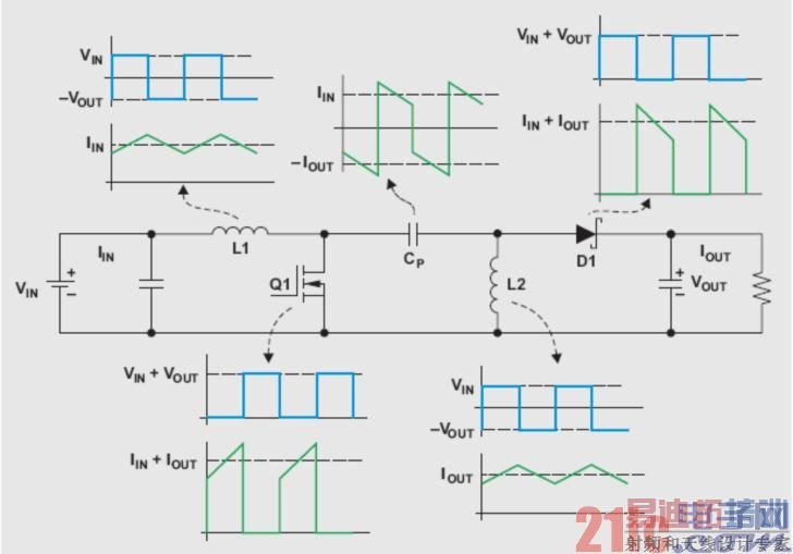 在图表2中显示了一个SEPIC转换器和其CCM模式下的理想波形。一个SEPIC转换器的电压转换率为: