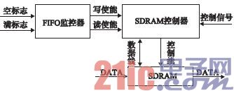 本文设计的FIFO系统由FPGA和SDRAM两部分组成。其中FPGA内部包含FIFO监控器、缓冲器、SDRAM控制器三个模块。FIFO监控器的作用是将SDRAM的状态转变成SDRAM控制器的读、写信号。若操作为向SDRAM写数据,则在SDRAM满时,FIFO监控器送出一个信号,以阻止写操作继续向SDRAM中写数据而造成溢出;若操作为向SDRAM读数据,则在缓冲器已空时,FIFO监控器送出一个信号,以阻止读操作继续从SDRAM中读数据而造成无效数据的读出。FIFO系统的模块结构如图3所示。