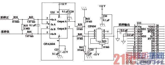 模数转换电路是整个系统的重要组成部分,它由差分放大适配电路、A/D转换器构成,如图1所示,其核心器件是A/D转换芯片ADS8515。