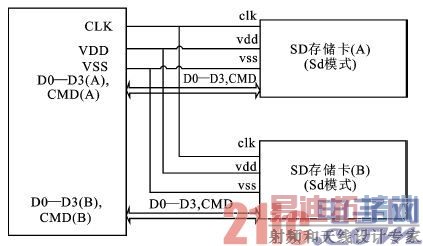 SD卡与控制器之间通过以下9线连接:时钟CLK、命令CMD、数据D0~D3、电源VDD和两根地线VSS。其总线拓扑结构如图1所示。命令和响应在CMD线上传输,数据在D0(标准总线模式)或D0~D3(宽总线模式)线上传输。