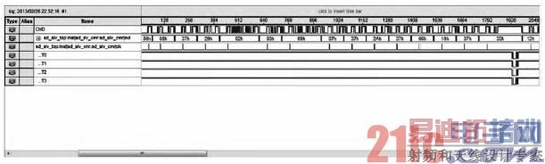 在硬件调试过程中,采用内嵌式逻辑分析仪(SignalTapII)来采集相应的数据波形。图8是采集到的识别SD卡命令与响应波形图。从图中可以看出,该设计可以正确响应主机命令,完成识别过程。