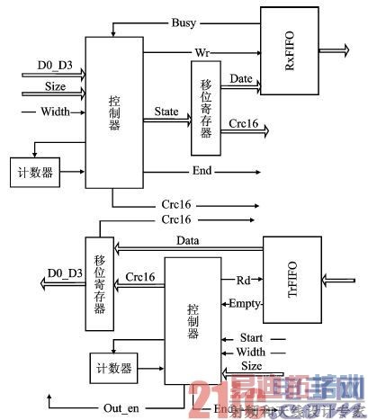 该模块的结构如图5所示。数据线也是双向的。Width信号指明当前数据传输模式为标准总线模式或宽总线模式。Size信号指示每个数据块包含的字节数。该模块包含两个数据缓冲,接收缓冲RxFIFO和发送缓冲TrFIFO,数据缓冲位宽16比特,深度为256,这是因为数据块最大为512字节。数据接收状态时,首先检测数据起始位,检测到起始位后计数器开始工作。接收Size个字节的数据后,接收CRC16校验位,最后完成数据块接收,发出接收完成信号End。数据接收过程中,每接收16位数据给出写入信号Wr,将数据写入RxFIFO。如果RxFIFO满,给出Busy信号,主机进入数据发送等待。数据发送状态时,接收控制器收到Start信号后,开始发出Rd信号读取TrFIFO数据,并将数据传给移位寄存器,使能数据输出控制信号Out_en,移位寄存器根据数据传输模式将数据输出。