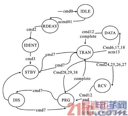 根据接收模块传送的命令编号产生与之对应的命令响应类型,进一步解析接收模块传送的命令参数。工作过程共有9个状态,状态间的转移关系如图6所示。接收到CMD0命令后都会从其它状态进入到空闲状态。