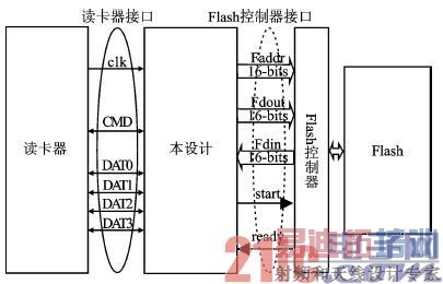 本设计的一端为SD存储卡标准接口,与读卡器连接。为了使接口有通用性,另一端与Flash控制器连接,从而达到与不同型号Flash连接的目的。本设计是连接读卡器和Flash控制器的一个中间模块。能够对读卡器发送的命令进行解析并响应,通过Flash控制器对Flash进行读写操作。整体设计方案如图2所示。