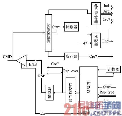 该模块的结构如图4所示。命令接收与响应发送都是在命令线CMD上传输的,所以该端口为一个三态门,由输出使能信号En控制是否输出。命令接收时,首先检测命令起始位,检测到起始位后计数器开始工作。当接收完一个完整命令,发出接收完成信号End,分别得到移位寄存器中对应的命令索引,命令参数,命令校验。命令接收过程中,同时将数据传给CRC7校验模块,用于生成校验数据。响应发送时,模块根据状态控制模块给出的响应类型产生对应的响应内容,当接收到发送使能信号Start后,给出发送使能信号En,并将响应的内容通过移位寄存器发送出去。响应内容发送完成后给出响应完成信号Rsp_over。