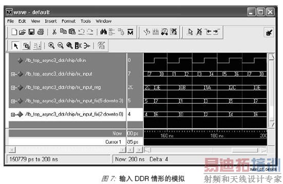 在使用 DDR 技术时,位操作可能很重要。DDR 生成环示例生成一条总线,总线的低阶位聚集在时钟的下降沿,而其高阶位则聚集在下一个上升沿。图7 是 DDR 设计模拟运行的屏幕截图,其中显示了这种位集中现象。此模拟运行假设所有迹线都是正确的(即没有进行引脚交换),以清楚地显示具体位的结束位置。