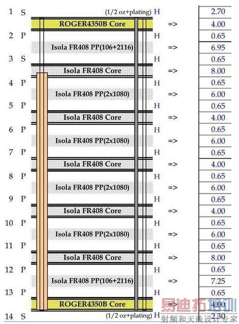 图1:多层电路板的叠层图,图中展示了FR4材料和Rogers 4350以及核心层厚度。