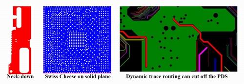 例如,一个高密度和高管脚数的器件由于有大量的过孔和反焊盘,在芯片封装结构及PCB的电源分配层上往往会形成所谓的Swiss-Chess结构效应。Swiss-Chess结构会产生很多高阻性的微小金属区域。根据