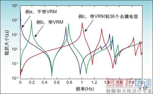 例子c的红线,在板上放置了一些去耦电容后,那个200MHz的谐振峰被移到了很低的频率处(<20MHz),并且谐振峰的峰值也降低了很多。第一个较强的谐振峰则出现在大约1GHz处。由此可见,通过在PCB上放置分立的去耦电容,电源供电系统在主要的工作频率范围内可以实现较低的并且是平滑的交流阻抗响应。因此,电源供电系统的噪声也会很低。