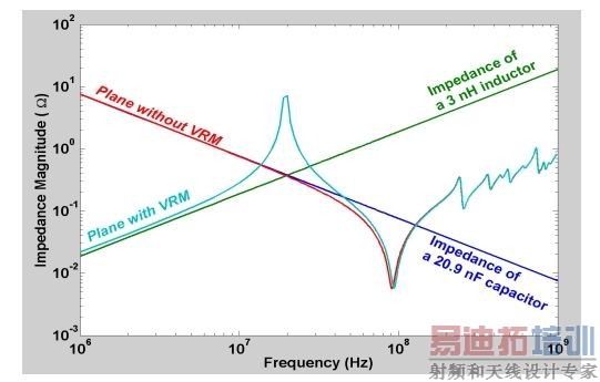 在交流分析中,PCB的电源地阻抗谐振是个特有的现象。图3展示了一对电源板层的输入阻抗。为了比较,图中还画了一个纯电容和一个纯电感的阻抗特性。板的尺寸是30cm×20cm,板间间距是100um,填充介质是FR4材料。板上的电源整流模块用一个3nH的电感来代替。显示纯电容阻抗特性的是一个20nF的电容。从图上可以看出,在板上没有电源整流模块时,在几十兆的频率范围内,平板的阻抗特性(红线)和电容(蓝线)一样。在100MHz以上,平板的阻抗特性呈感性(沿着绿线)。到了几百兆的频率范围后,几个谐振峰的出现显示了平板的谐振特性,这时平板就不再是纯感性的了。