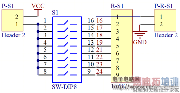 拨码开关就是相当与一个开关量,拨到ON 就表示接通,OFF 就是断开,在数字电路中对 0、1,通常用于二进制输入。本课题最小系统板使用八位拨码开关作为一个字节的输入,拨到ON 时相当于输入“1”,默认输入“0”。