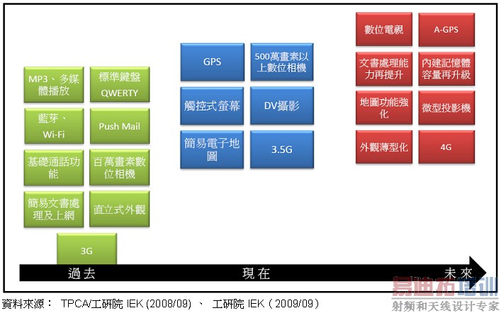 图三显示出,除了文书处理功能外,Smart Phone近年也整合GPS、扩大内建记忆空间、相机画数提升及自动变焦..等,此外自从iPhone吹起触控热及为了更贴近消费者使用上网服务的操控便利性,从2008下半至2009年起,触控萤幕似乎成为Smart Phone的标准配备,其中包含NOKIA 5800XpressMusic、HTC Touch Diamond等系列手机、RIM BlackBerry Storm 9500…等。 而未来将有机会再整合微型投影机、文书处理功能再提升、扩增数位电视功能…等,往新世代个人行动运算装置的方向改变,以更满足长期移动者对于视听娱乐的需求。