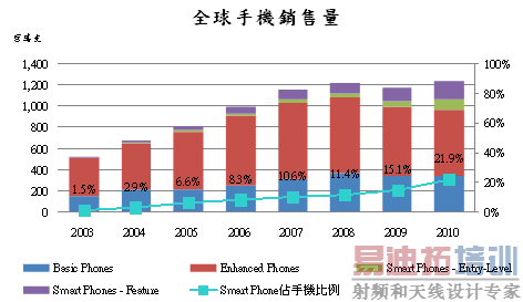 2008年Smart Phone市场销售量1.39亿支,市场渗透率11.4%,2009年预估将达1.77亿支,市场渗透率上升至15.1%(图一)。 显示Smart Phone已经突破局限于商务消费者使用,已有一定比例的市场需求延伸至一般消费大众。
