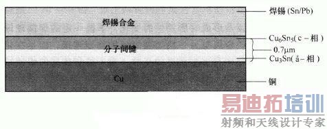 采用铜作为金属基材,锡-铅作为焊锡合金,铅与铜不会形成任何金属合金共化物,然而锡可以渗透到铜中,锡和铜的分子间键在焊锡和金属的连接面形成金属合金共化物Cu3Sn 和Cu6Sn5,如图所示。