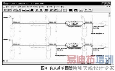 这里以TD-SCDMA终端基带电路中的ADC和DAC芯片MAX19700为例,说明对其时钟线的串扰抑制。首先要用一个简单模型来代表时钟电路,由LineSim建立模型如图4。