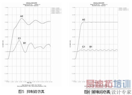 从图5中可以看出串扰的幅度比较大,因此需要采取办法抑制串扰。图6的仿真波形是修改了简单模型的约束条件而得到的,主要修改了信号的结构,将两个网络分别放到了不同的层里,耦合长度也减短为3in,由图6可知串扰得到了明显的抑制。将这一约束条件直接带入下一步的布局布线中,可以抑制串扰,且不需再单独对这一网络进行BoardSim仿真,节省了时间。