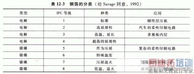 确定了它们的力学悖能。根据铜箔的力学性能和应用,每一种铜箔又进一步被分成不同的等级。表12-3 中给出了铜箔的分类,电解铜箔和锻碾铜箔分别被分为四个等级(Savage. 1992) 。通常电解铜箔为1 - 4 级,用于刚性印制电路板中。柔性印制电路使用所有的电解铜箔和锻碾铜箔的5 - 8 级。典型的2 , 5 , 7和8 级被应用在柔性层压板中。