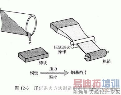 压延退火铜箔的制造,首先要加热铜链,然后把它们送入一系列的滚筒中,使它们缩减为指定厚度的铜箔,如图12-3所示。旋转生成了铜箔中的颗粒结构,这些颗粒结构看起来像搭接的水平面上。在压力和温度的作用下,大小不同的铜颗粒之间相互作用,这就行成了铜箔的性能,例如延展性和硬度,同时也产生了一个光滑的表面。与电解铜箔相比,这种生产工艺生产的铜箔能承受更大的反复弯曲。
