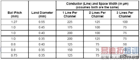 表1:使用触点直径和球间距计算过孔尺寸。(注:Ball pitch: 球间距