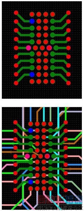 图6所示的扇出方法避免了使用高端技术,而且不影响信号完整性。BGA引脚被分成内部和外部引脚两个部分。焊盘内过孔用于内部,外部引脚在0.5mm栅格上扇出。图7a显示的是顶层,图7b显示的是顶层和内部布线层。