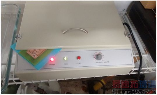 现在万事俱备,可以用紫外光照射阻焊层了。这时需要一个紫外灯。对于小板子来说,美甲灯就行了,价格是20美元。对于大板子而言,需要一个平板型的紫外线灯,价格大约75美元。平板灯之所以好,是因为盖板有个锁止装置,可以将幻灯片压在电路板上,提高图像的分辨率。