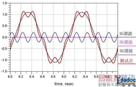 这样,我们就看到了1GHz的谐波在接收端时蓝色的波形,在测试点处为红色的波形,幅值衰减,相位超前。