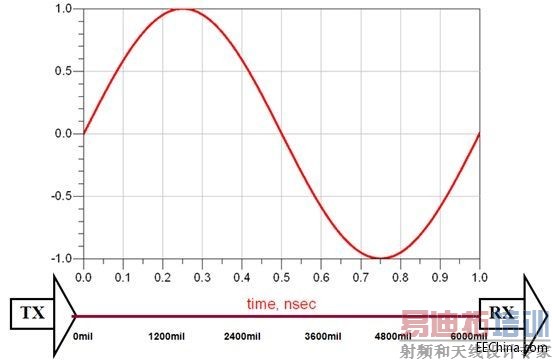 我们要在一条传输线上完成一个1GHz的正弦波,这条传输线大概需要6000mil。所以很多时候我们以为我们传输线上的波形是这样子的: