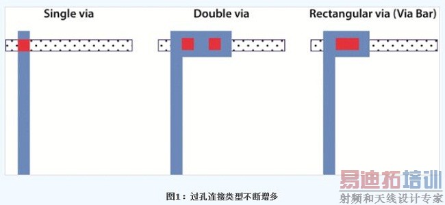 过孔故障一直是影响良率的重大因素。过孔冗余(双过孔)被引入65纳米版图设计中,帮助减少制造过程的变动所引起的过孔故障。对于28纳米节点,明导添加了一种矩形过孔(有时也称条状过孔)。以矩形过孔而非双过孔代替单过孔可以预防过孔故障,同时减少过孔总数。图1显示了三个过孔类型。
