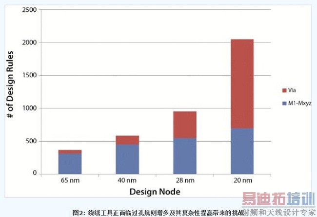 1,在小的节点设计中,连线更具挑战性,不仅需要新的配置,(这些配置大节点设计不太常用),而且还要考虑先前大节点中并不重要的因素。例如,在20纳米节点上,过孔的选择需要同时评估金属末端-1和+1。绕线不再是仅仅优化过孔,而是同时考虑上下方的金属以及过孔连接金属的方向。