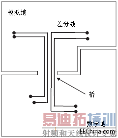 如果在这种情况下,做pcb layout时没有注意相互间的连线,电流的流经回路会被扩大,在高频电路中,大的电流回路会产生高接地电感,这样会对模拟电路产生很大的影响和干扰。这时,我们常采用单点接地、差分线或者星型接地来减少回路,如果模拟电路和数字电路之间的走线相当重要,这就需要一个“桥”的概念,通过该桥和差分线,减少干扰。如下图所示: