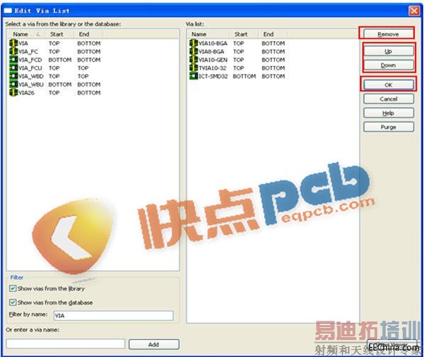 Remove 可以移除过孔。在左边的过孔列表中双击即可添加过孔。同理,可设置其他物理规则的过孔,如下图所示。